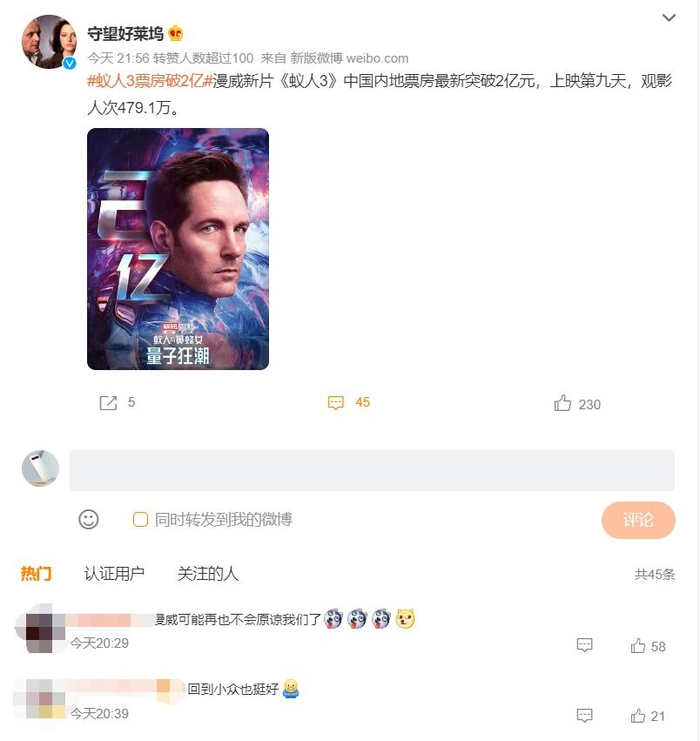 近日消息,猫眼专业版数据显示,漫威新片《蚁人3》上映第九天,中国内地票房突破2亿元,观影人次479.1万。 对此,有网友留言,回到小众也挺好。