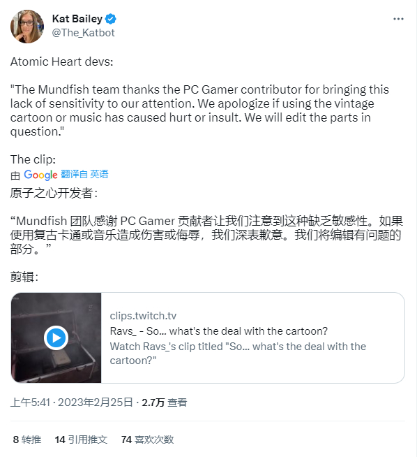 社交媒体上的少数批评声音,得到了外媒PCGamer的报道和扩散。PCGamer进一步指出,《原子之心》不仅原封不动保留了动画片段,也没有在播放动画之前给予玩家任何警告或上下文提示。作为参考,21世纪的视频网站,会给《猫和老鼠》的备份标注一则免责声明或警告,如“种族主义内容警告”或“该节目包括对人或文化的负面描述和/或虐待”等字样。