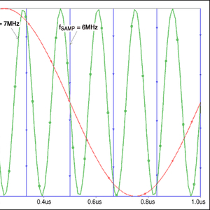 从数学角度看,如果没有频率混叠,所有低于fSAMP/2的频率成分都将出现在频谱中。然而,由于频率混叠,任何高于fSAMP/2的谐波成分(fHARM)也会作为镜频出现,频率为:|± K x fSAMP ± fHARM |,其中K = 1, 2, 3, 等。