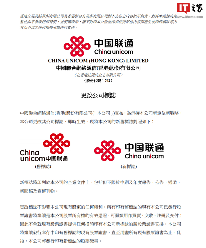IT之家 2 月 28 日消息,中国联通 (0762.HK) 近期发布公告,中国联合网络通信 (香港) 股份有限公司宣布,为承接公司新定位新战略,公司更改其公司标志,即时生效。