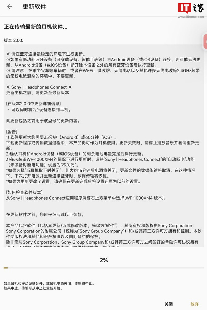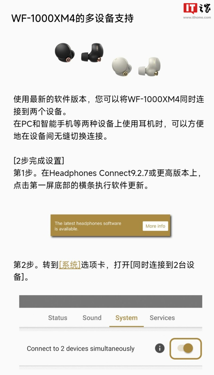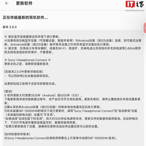 IT之家 2 月 28 日消息,索尼 WF-1000XM4 降噪豆现已获推 2.0.0 固件更新,带来了同时连接 2 台设备的功能。