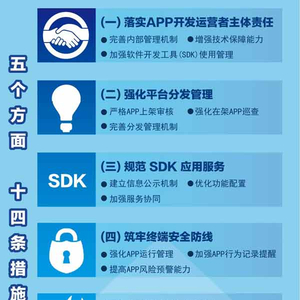 移动互联网应用服务涉及APP开发运营、分发、运行等多个链条,需要行业上下游各企业主体加强协同、共同努力营造健康的服务生态。《通知》根据服务形态、业务场景、功能特点,重点针对5类主体提出了具体规范要求:APP开发运营者直接面向用户提供服务,要落实主体责任;分发平台为用户提供APP搜索、下载安装渠道,要强化分发管理;SDK内嵌在APP中,广泛应用于定位、支付、信息推送等功能场景,要规范应用服务;智能终端为用户提供APP运行的硬件载体,要筑牢安全防线;接入企业提供网络连接服务,要夯实信息登记和处置责任。通过各链条联防共治,共同提高行业整体服务水平。
