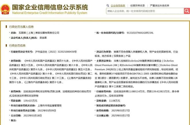 据国家企业信用信息公示系统,上海市市场监督管理局行政处罚决定书(沪市监总处〔2022〕322021000436号)显示,瓦丽葆(上海)美容仪器有限责任公司因销售不符合保障人体健康和人身、财产安全的国家标准的宙斯Dr.Arrivo24K魅影美容仪,被罚没款共计150万余元。