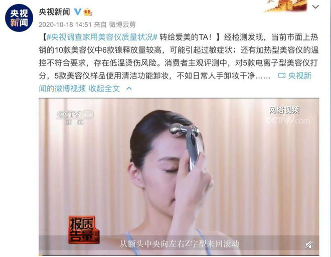 此前,央视新闻频道《每周质量报告》针对市场上10款美容仪进行测评,测评结果显示,市场热销的报道中选用的市面上10款热销美容仪,其中6款产品的镍释放量不符合相关标准要求;5款产品清洁功能卸妆不如日常人手卸妆干净;还有5款产品温热导入未能达到广告宣传效果。