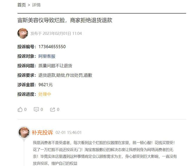 315消费者权益保护日将近,《拾盐士》在黑猫投诉平台注意到,有消费者投诉称自己使用知名品牌宙斯美容仪导致“烂脸”,但商家拒绝退货退款。