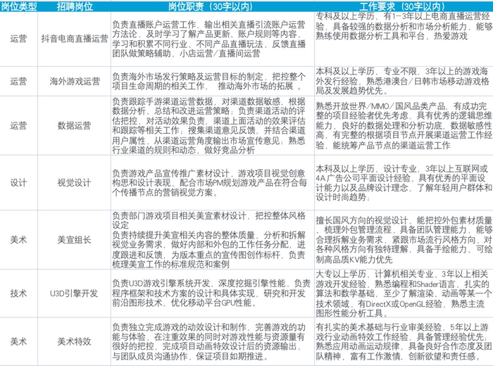 岗位类型方面,考虑到目前三七互娱在MMORPG、SLG、卡牌及模拟经营等四大核心赛道上进行多元化布局,所以公司招聘目标及方向都在围绕这几个核心赛道去做调优。
