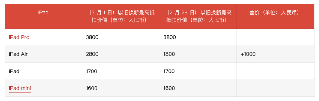 iPad 机型表格如下,其中 iPad Air 的最高以旧换新价格为 2800 元,增加了 1000 元。