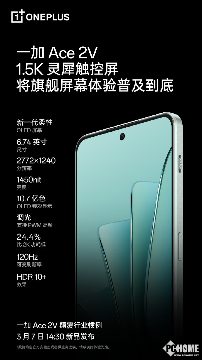 在屏幕规格上,一加 Ace 2V采用的是一加 Ace 2的同款面板,拥有120Hz可变刷新率,1.5K超视网膜分辨率,1450尼特超高亮度,支持高频PWM调光,功耗比2K屏低了24.4%。