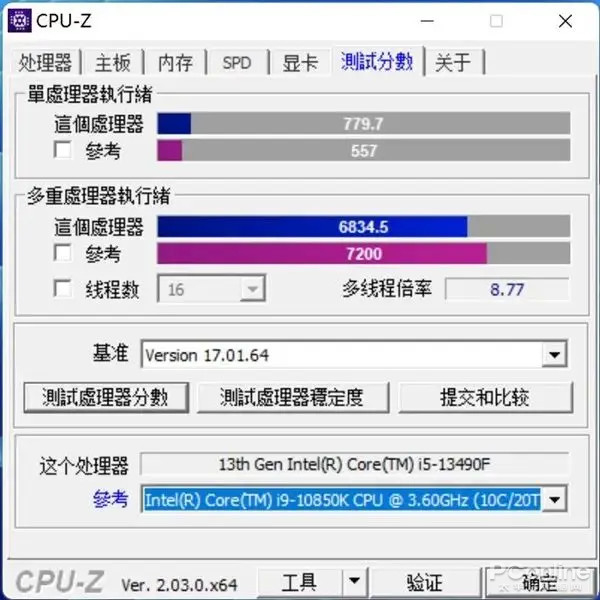 性能方面,i5-13490FCPU-Z的跑分中,单线程、多线程分别可以跑到779.7分、6834.5分,相比于i5-13400F分别高了6%、4.5%。性能提升幅度还是比较可观的。