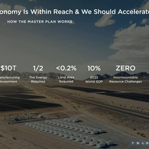 马斯克认为,使用化石燃料浪费了大量能源,实现可持续的能源经济需要达到以下目标:电池储能240太兆瓦(TWH),可再生电力30 TWH,制造领域投资10万亿美元,需要能源为燃料经济的一半,占地面积低于0.2%,占2022年全球GDP的10%,无法克服的资源挑战为零。