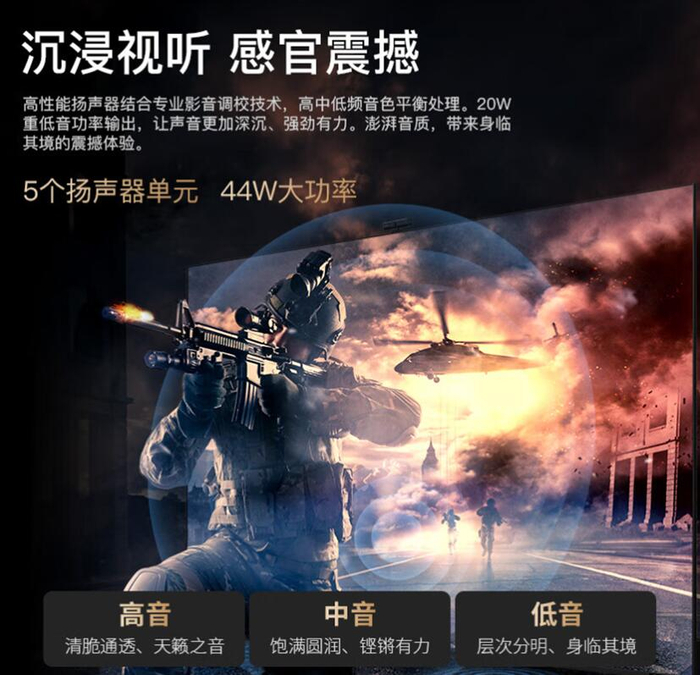 想要听声辨位和更好的沉浸感的话,电视音效起到了关键的作用。夏普AQUOS V系列电视针对游戏玩家设计了颠覆性的三大法宝,杜比音画、DTS Virtual:X(天空音)、高性能扬声器(5个扬声单元,50W大功率,20W重低音),使得不同发声元素都能从对应位置的驱动单元中发声,玩需要听声辨位的游戏时,就连角色后方的爆炸和脚步声都能很好地被呈现出来,极大地增强临场感,使人能够感受到来自四面八方的声音。有了更加逼真的音效体验,再配合5个高性能扬声单元,处理高中低频音色强劲而有力,20W的重低音也会给声音一种强劲澎湃之感,使游戏玩家感受到震撼的沉浸体验。
