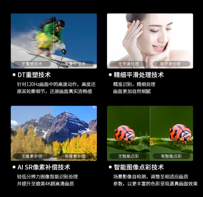 对于硬核游戏玩家而言,电视的高画质和高刷新率等配置是必不可少的。在游戏中,胜负之间的差距通常只在毫秒之间。夏普AQUOS V系列电视可以为玩家提供明显的技能加成,让他们更快地发现对手并更容易跟踪对手的行动,从而显著提高胜率。采用的全通道4K 120Hz高刷屏技术,可为玩家在RTS即时战略类、竞速类和体育类游戏中提供优异的游戏体验。这不仅能够进一步提升游戏画面的流畅度,使画面的动态效果变得更加细腻清晰,还可以让玩家在不错过游戏中的任何细节,更容易掌控先机的同时,将每一个角色的动作都会展现得十分逼真,从而感受到前所未有的沉浸感和快感。