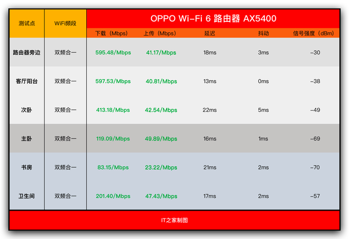IT之家针对路由器位置、客厅阳台、次卧、主卧、书房、卫生间六个区域进行了速率、信号强度测试,为保证数据的真实性,每个位置均测试 2 遍,且取最高成绩。