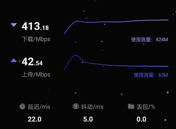 接下来是次卧区域。由于隔了一堵承重墙,网速虽没有“增速”那么夸张,但也达到了 413 / Mbps 的下载速度。