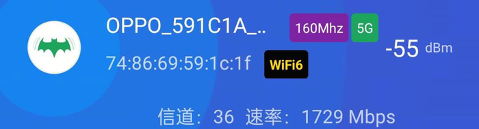 可以看到,在 160MHz 频宽下,速率达到了 2161Mbps,距离路由器稍远的一点的卫生间,速率也达到了 1729Mbps。