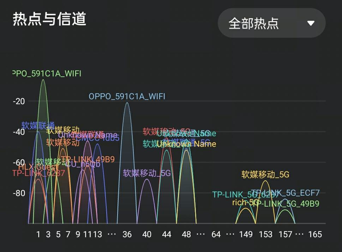 通过上图可以看到,在办公室等复杂的网络环境下,OPPO Wi-Fi 6 路由器 AX5400 依旧能够选择独立的信道。