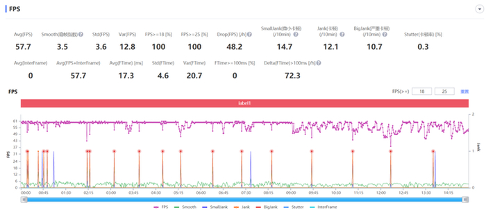 《原神》作为目前对于手机硬件要求较高的手游,我们使用PerfDog来对手机的游戏帧率进行测试,测试时我们游戏设置为中等画质,60帧模式下运行15分钟,三星Galaxy S23 Ultra的平均帧率为57.7fps,游戏过程还算流畅,但在游戏过程中进行战斗时偶尔会出现降帧的情况。