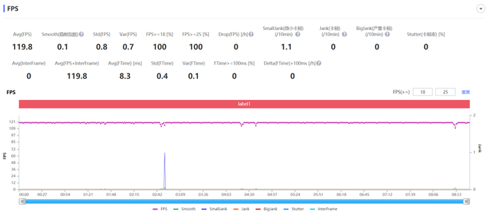 而在《王者荣耀》手游中,三星Galaxy S23 Ultra的表现可谓非常的强悍且稳定,在PerfDog记录的成绩中达到了119.8fps的平均帧率,几乎可以在极高帧率模式下达到满帧运行,游戏时整体的流畅度表现非常的出色。