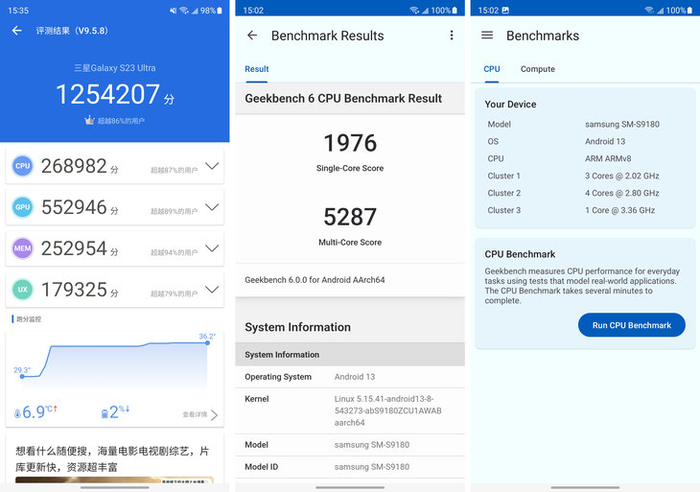 在实际的性能测试中我们也看到,三星Galaxy S23 Ultra确实确实发挥除了顶 级旗舰机该有的水平,经过实测,三星Galaxy S23 Ultra在安兔兔上的跑分成绩超过了125万分,在测试中跑分监控显示机身温度最 高仅为36.2℃,跑分期间温度上升低于7℃,对于温度的控制十分出色。同时,GeekBench 6跑分成绩为单核1976分,多核5287分。