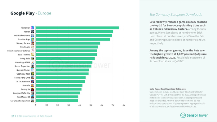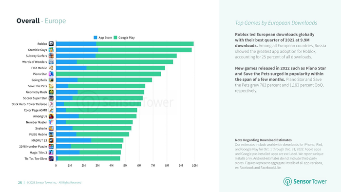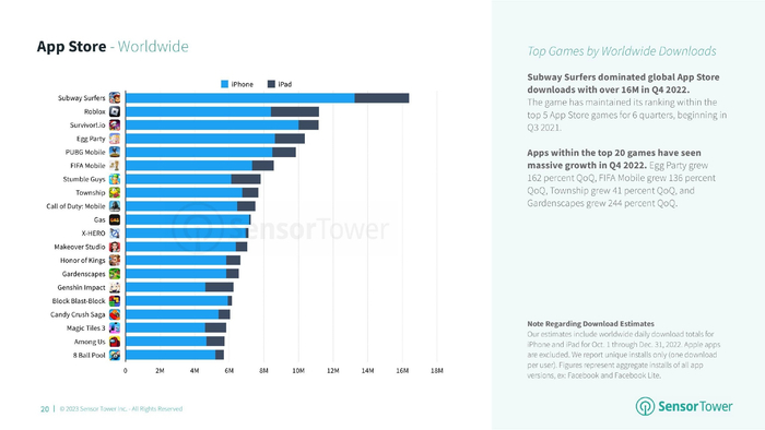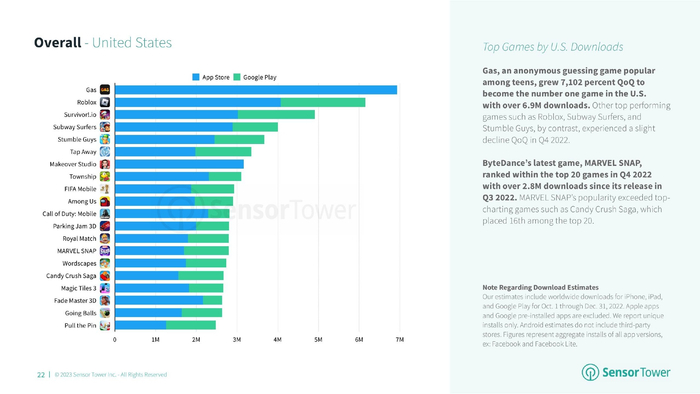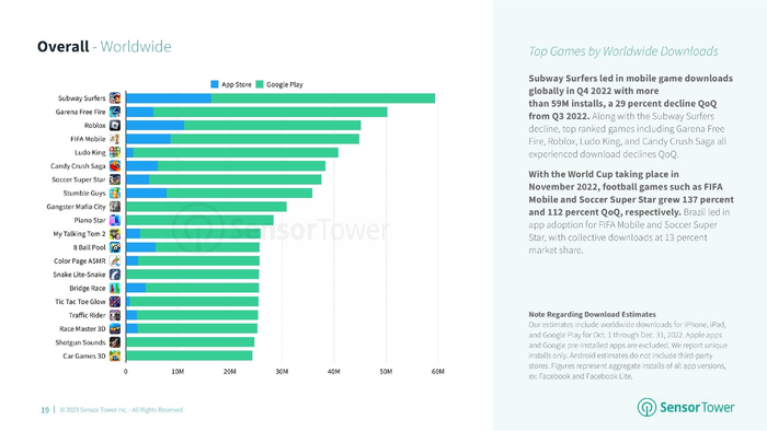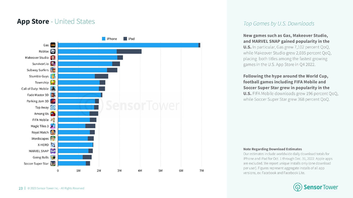 虽然顶级手机游戏的全球下载量环比下降,但世界杯等赛事推动了足球游戏的下载量。《FIFA Mobile》和《Soccer Super Star》在 2022 年第四季度分别环比增长137%和112%。