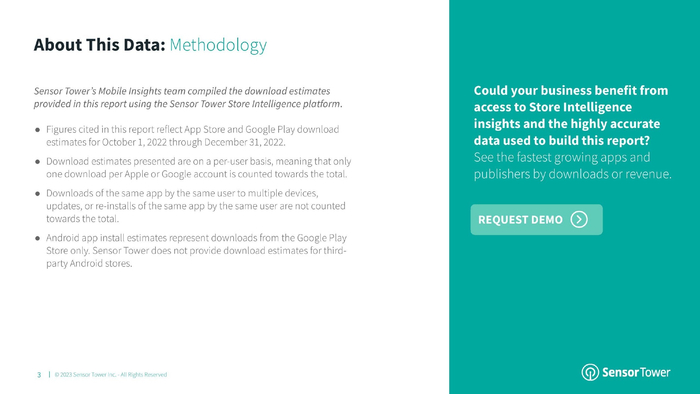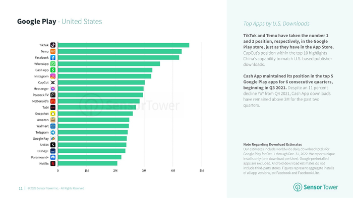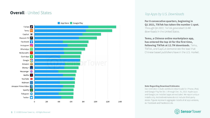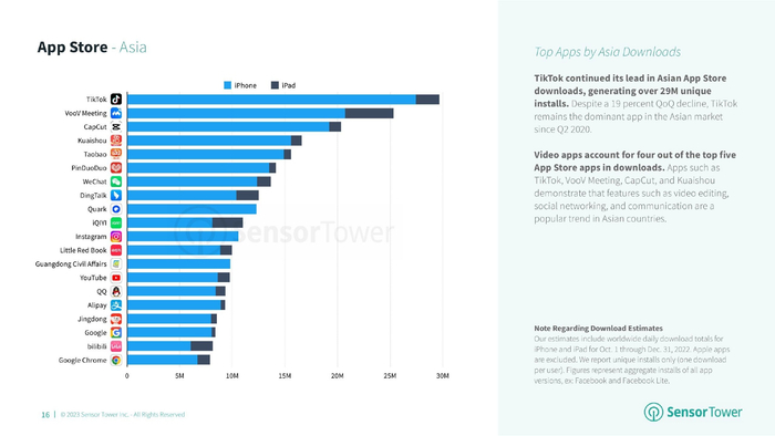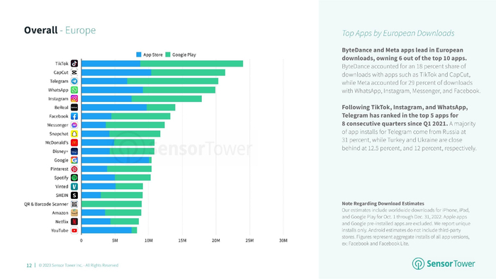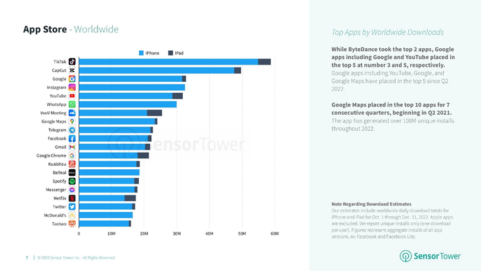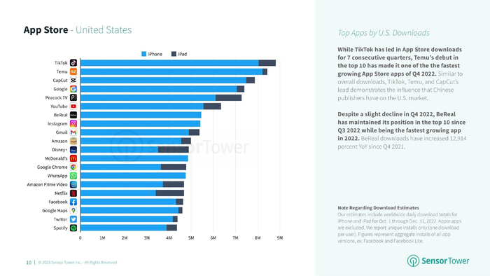 社交媒体应用程序仍然竞争激烈。自 2021 年第二季度以来,Instagram 在过去7个季度中一直占据前三名的位置,并在 2022 年第四季度保持其全球第一应用程序的排名。TikTok 和 Facebook 分别位居全球第二和第三。