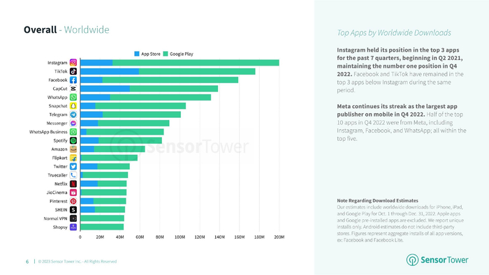 社交媒体应用程序仍然竞争激烈。自2021年第二季度以来,Instagram在过去7个季度中一直占据前三名的位置,并在2022年第四季度保持其全球第一应用程序的排名。TikTok和Facebook分别位居全球第二和第三。
