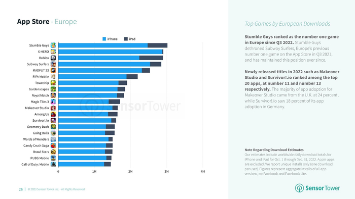 Kitka Games 的《Stumble Guys》是一款出色的移动应用程序,主导了 2022 年的下载量增长。这款游戏是 2022 年下载量增长最快的应用程序。在拉丁美洲和欧洲排名第一,2022年在这些地区的下载量分别超过 5000 万次和 3600 万次。