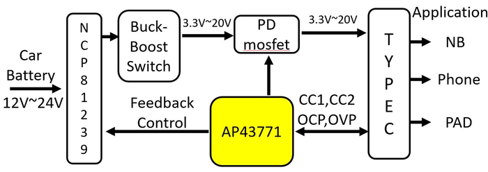 随著支援快速充电的智能手机越来越多,当你使用过“快速充电”规格之后,那种“回不去”的感觉应该印象深刻吧!目前许多 110v~240v 电源充电器已经对应 QuickCharge 4 (QC 4.0)& QuickCharge 4.0+ (以下简称 QC 4.0+) & PD快速充电规格,那.....车上呢?此方案提供 USB Type-C 快速充电的 Power Delivery 充电模式,让你在车上也可以享受快速充电带来的便利,以下为此方案针对各别IC功能简易介绍。