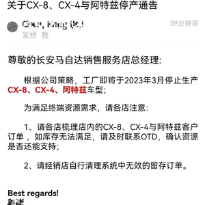 3月3日,一则“关于CX-8、CX-4与阿特兹停产通告”在网络上流传,据通告内容可知,长安马自达工厂将于今年3月停止生产以上三款车型。