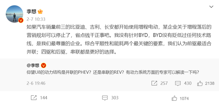 这位经常活跃在社交媒体上的CEO点评了“仰望”,并在动力技术路线选择方面给出了建议。