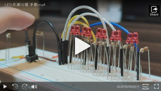 本次使用的晶体管是“2SC1740S”。它是NPN型晶体管,集电极电流额定值为150mA。这次的作品每个LED通过10mA的电流,10个LED并联,总共需要进行100mA电流的开关,在“2SC1740S”的额定范围内。