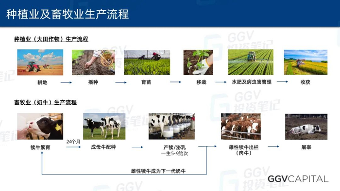 从种植业的生产流程看,以大田作物为例,整个流程包括:耕地、播种、育苗、移栽、水肥及病虫害管理、收获。从畜牧业的生产流程看,以奶牛为例,整个流程包括:犊牛繁育、成母牛配种、产犊/泌乳、雄性犊牛出栏、屠宰。其中在母牛产犊后,雌性的母牛便成为下一代的奶牛,再次经历整个流程。而一头奶牛从小牛成长为成年母牛后,会经过5次的配种和产奶,才会最终被宰杀,生命周期很长,生产的价值也非常高。