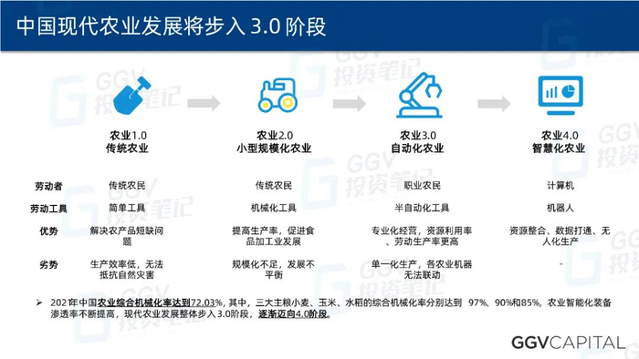 2021年,中国农业综合机械化率(农业生产中使用机器完成的作业量占总作业量的比例)达到了72.03%,其中,三大主粮小麦、玉米、水稻的综合机械化率分别达到了97%、90%和85%,农业的智能化装备渗透率不断的提升,中国整体的农业发展步入了3.0阶段——「自动化农业」阶段。