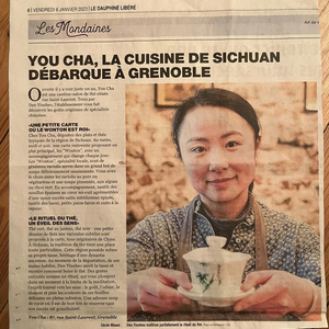 “2022年底的时候,我突然接到当地媒体的电话,说想采访我。这个媒体专门做阿尔卑斯大区的吃喝玩乐指南,也跟当地报纸有合作。记者来拍了很多照片,拍我怎么包抄手、煮汤、给客人泡盖碗茶、教客人喝茶......记者还在店里尝试了一下盖碗茶,她尝试后觉得很不错。”