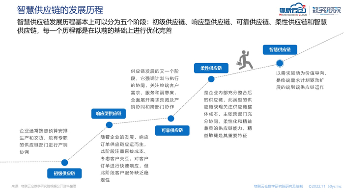 智慧供应链发展历程基本上可以分为五个阶段:初级供应链、响应型供应链、可靠供应链、柔性供应链和智慧供应链,每一个历程都是在以前的基础上进行优化完善。