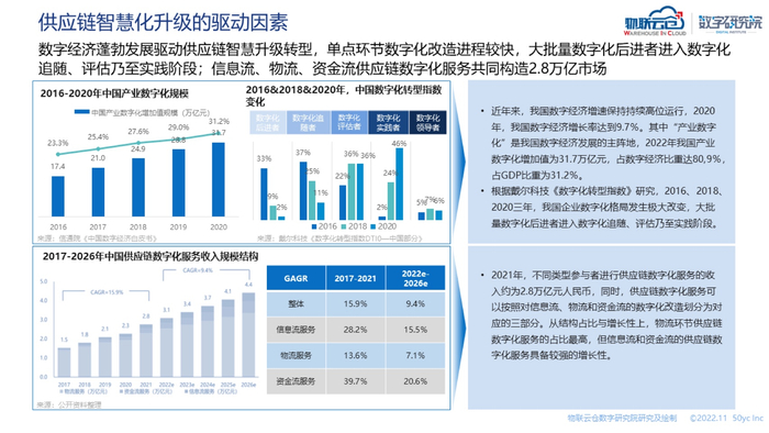 数字经济蓬勃发展驱动供应链智慧升级转型,单点环节数字化改造进程较快,大批量数字化后进者进入数字化追随、评估乃至实践阶段;信息流、物流、资金流供应链数字化服务共同构造2.8万亿市场。