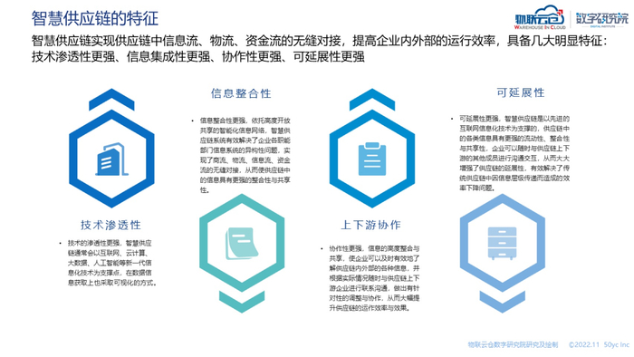 智慧供应链实现供应链中信息流、物流、资金流的无缝对接,提高企业内外部的运行效率,具备四大明显特征:技术渗透性更强、信息集成性更强、协作性更强、可延展性更强。
