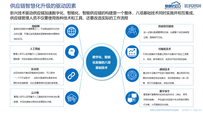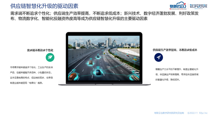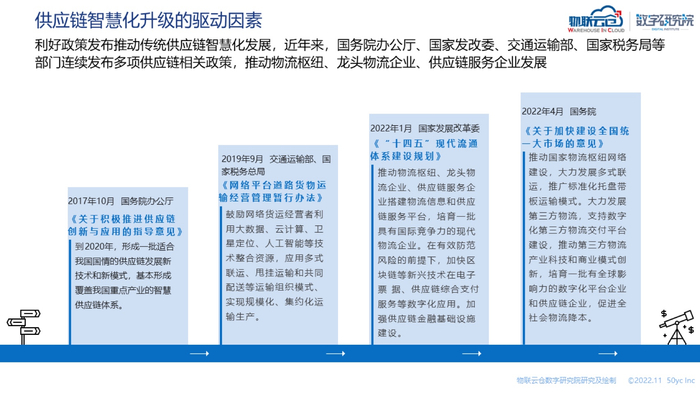 需求端不断追求个性化;供应端生产效率提高,不断追求低成本;新兴技术、数字经济蓬勃发展、利好政策发布、物流数字化、智能化投融资热度高等成为供应链智慧化升级的主要驱动因素。