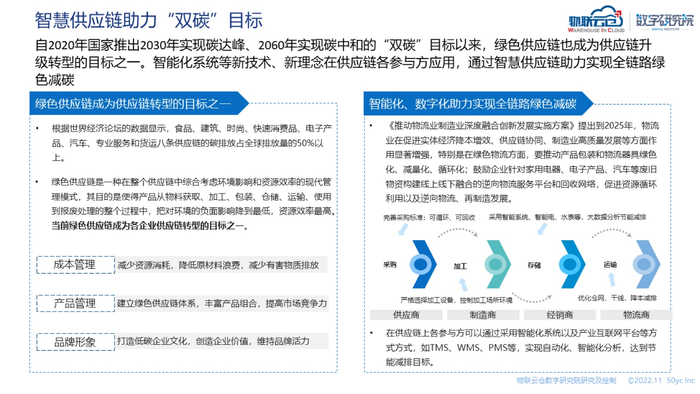 自2020年国家推出2030年实现碳达峰、2060年实现碳中和的“双碳”目标以来,绿色供应链也成为供应链升级转型的目标之一。智能化系统等新技术、新理念在供应链各参与方应用,通过智慧供应链助力实现全链路绿色减碳。
