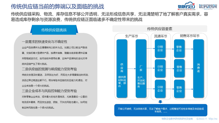 供应链采购、物流、库存信息不够公开透明,无法形成信息共享,无法清楚明了地了解客户真实需求,容易造成库存剩余与资源浪费,传统供应链正面临诸多不确定性带来的挑战。