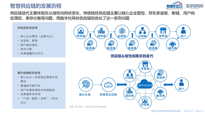 供应链迭代主要体现在从线性向网状变化,传统线性供应链主要以核心企业管控,存在多层级、断链、用户响应滞后、库存分散等问题,而数字化网状供应链则优化了这一系列问题。
