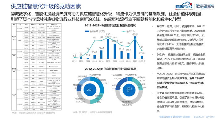 物流数字化、智能化投融资热度高助力供应链智慧化升级,物流作为供应链的基础设施,社会价值体现明显,引起了资本市场对供应链物流行业科技创新的关注,供应链物流行业不断朝智能化和数字化转型。