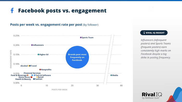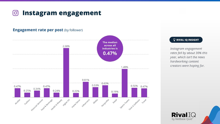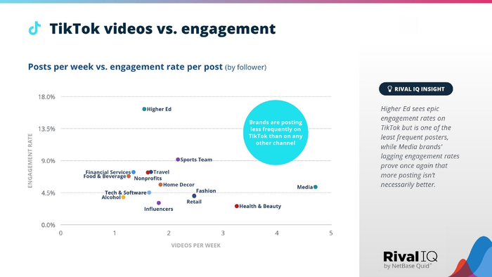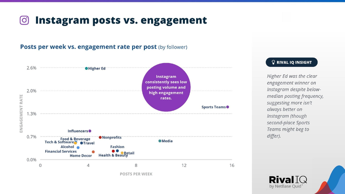 尽管在Instagram上的发帖频率低于媒体,但高等教育显然是参与度的赢家,这表明在Instagram上更多并不总是更好,尽管第二名的运动业可能会有所不同。