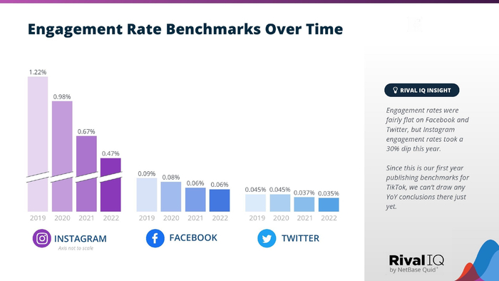 RivalIQ发布了“2023年社交媒体行业基准报告”。今年的品牌有机参与度有所下降。Instagram的参与度连续三年下降,但Facebook和Twitter的参与度保持稳定。
