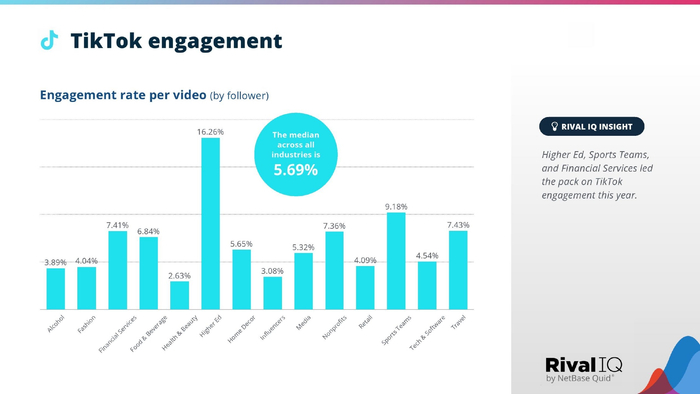TikTok在排行榜上名列前茅,平均参与度为5.69%,是今年各个行业最好的伙伴。