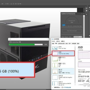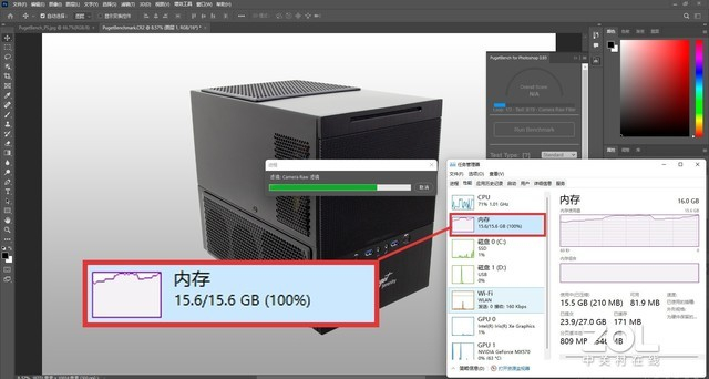 我们用16GB内存笔记本来通过Photoshop去处理大规格的图片,可以看到16GB空间很快就会被完全占满,在100%内存占用率下,想要干点其它事情是极为困难的。比如笔者在100%内存占用率下,即便打开WPS文档进行简单的文字录入,都会有明显的滞后和卡顿感。