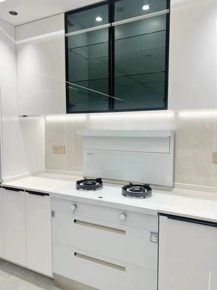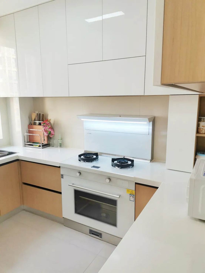 冰箱和集成灶都采用了白色系,来柔滑空间的硬朗性。奥田消毒柜款集成灶D3采用极致纯白的底色,线条流畅,铺叙至简。1台集烟机、灶具、消毒柜、储物柜、恒温台面等多种功能于一体,合理地利用了空间布局,整体搭配平衡且有呼吸感。释放了吊柜空间用来做收纳,是小户型厨房的不二之选。搭配20m³/min的风力和430pa的风压,吸净油烟无油烟倒灌困扰。