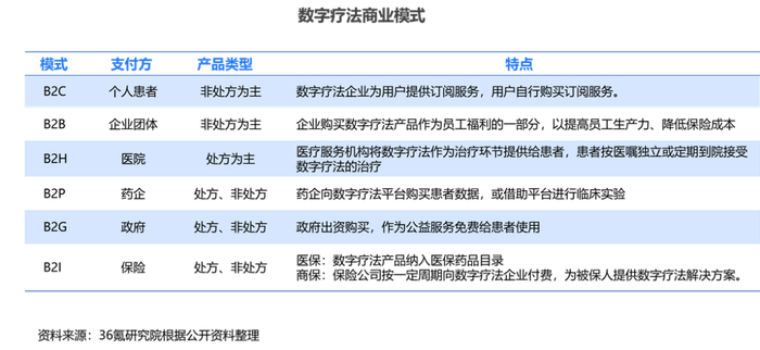 (3)B2H:医生通过处方药的形式将DTx产品开具给患者,并根据患者的自身情况,调节患者的使用频次和计量。该模式是DTx企业研发产品、建立患者信任的重要渠道。