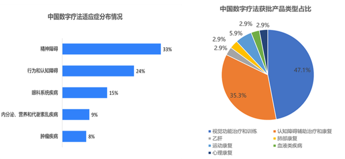 从适应病种分布来看,绝大多数疾病领域都已进行了数字疗法的尝试和探索,精神疾病、行为和认知障碍疾病现已成为我国最为热门的布局领域,占比分别达到33%、24%。
