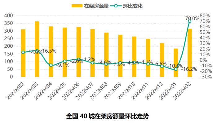 据58安居客研究院统计数据显示:2023年2月,全国40城二手房在架套数为315套,环比上月增加70%,并且二手房在架套数也在连续7个月下跌之后首次出现上涨。2月在架量的大幅上涨是市场回暖的主要表现,其次是1月春节假期是传统低点。